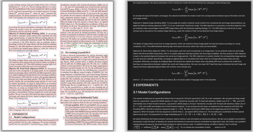 【公式检测与识别】由于公式(尤其是内联公式)在视觉上可能与文本难以区分,若不提前检测公式,后续文本提取可能出现乱码,影响文档整体准确性。因此,在整个文档解析流程中还需要考虑使用MFD(Mathematical Formula Detection)与MFR(Mathematical Formula Recognition)模型,并通过使用大规模数据训练与调优,提升各种类型公式的检测和识别的准确率。