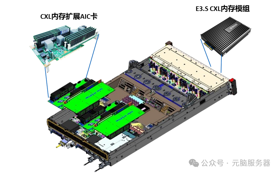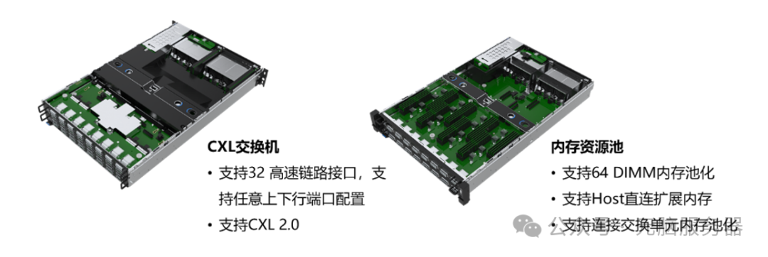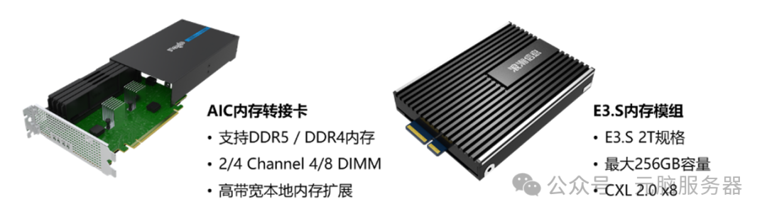 面向单机系统内存容量及带宽无法满足当前应用需求的问题,浪潮信息自研了CXL内存远端扩展原型系统,在百纳秒级访问延时的条件下,系统内存容量和带宽扩大一倍。同时内存扩展产品覆盖多种形态,包括业界最大单卡扩展规模的CXL内存扩展卡(单卡支持8 DIMM扩展)、支持DDR4/DDR5 DIMM扩展方案、自研E3.S CXL内存模组,满足客户不同场景应用需求。