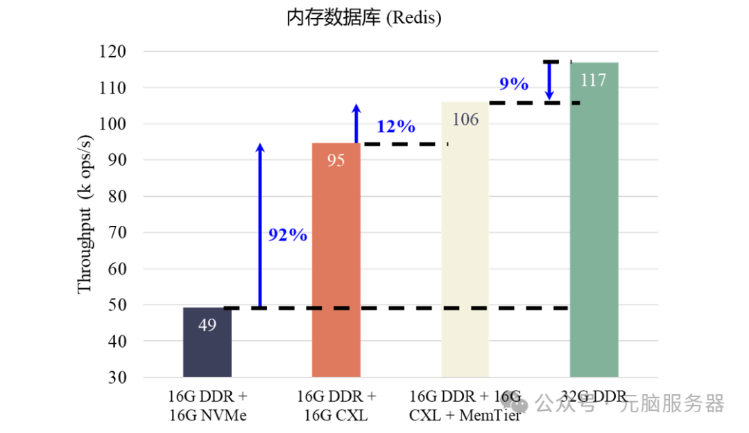 在金融交易、商业智能等内存数据库应用场景中,元脑服务器CXL内存池化方案扩展了数据库的可用内存容量,数据库吞吐量可提升92%;其内存分层功能实现了本地内存与CXL远端内存之间的冷热页面迁移,开启此功能可再提升数据库吞吐量12%,相比使用更高内存容量的内存条,性能仅低9%。