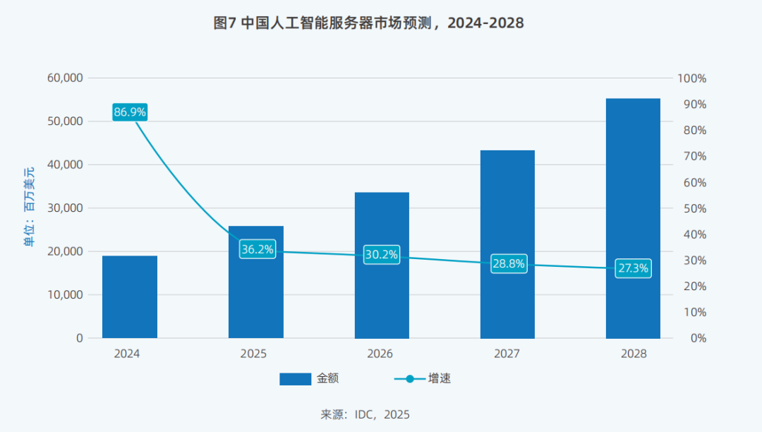数据显示,2024年中国人工智能算力市场规模达190亿美元,2025年将达到259亿美元,同比增长36.2%,2028年还将进一步增加至552亿美元。