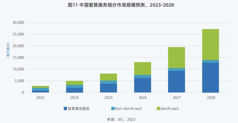 其中,智算集成服务市场(即私有化部署市场)及GenAI IaaS市场是未来重要的两个增量市场,五年年复合增长率分别达到73%和79.8%,预计至2028年智算集成服务市场规模占比可达47%,GenAI IaaS市场规模占比达48%。