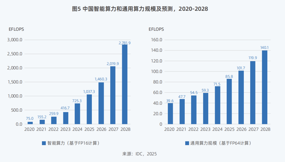 而从整体市场来看,《报告》预计,2023至2028年,中国智能算力规模和通用算力规模的五年年复合增长率将分别达46.2%和18.8%,较上一版本预期值33.9%和16.6%有显著提升。