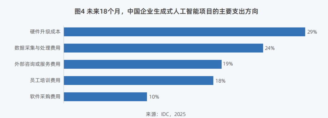 《报告》也显示,未来18个月内,为了将大模型引入生产,除了硬件的升级会是企业的首要投资目标外,软件和服务方面的支出也会是企业生成式AI项目的主要支出方向。