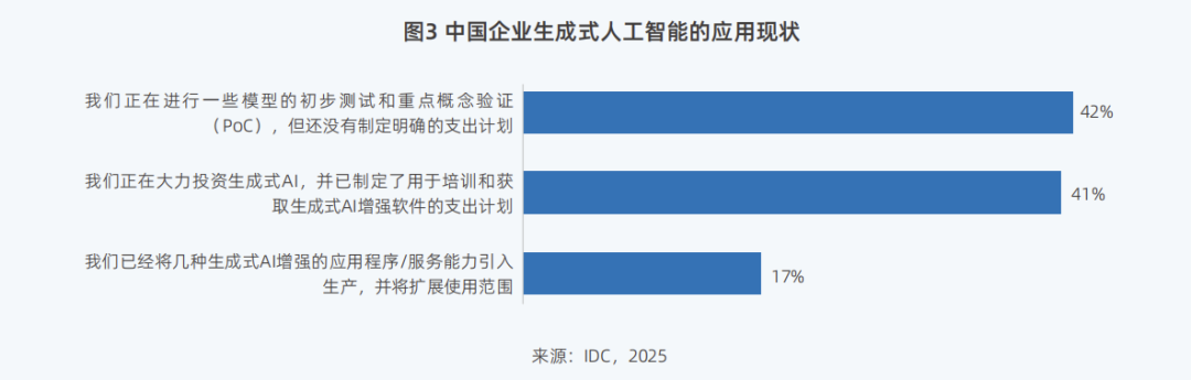 目前42%的中国企业已开始进行大模型的初步测试和重点概念验证,17%的企业已将技术引入生产阶段,并应用于实际业务中。