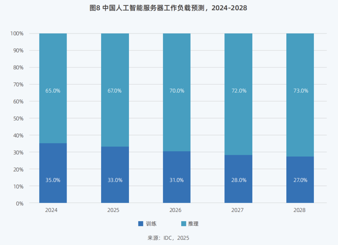 与之相对应的是,2024年,国内推理与训练的工作负载占比已分别达到65%和35%。《报告》预计,到2028年,推理工作负载占比还将进一步达到73%,远超训练算力27%的占比。