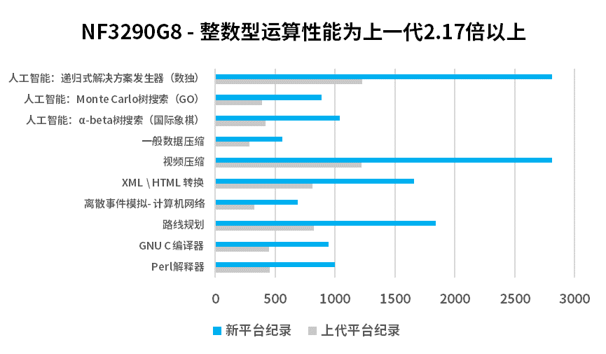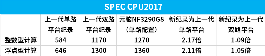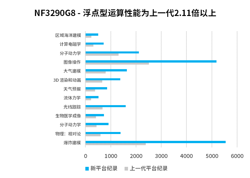 全新一代元脑服务器NF3290G8基于系统创新优化,在SPEC CPU2017测试中创下行业新标杆:整数型和浮点型运算性能为上一代纪录大幅的2.17倍和2.11倍,双双突破单路服务器在SPEC CPU测试中的性能纪录,一台的性能远超过去两台,并且反超上一代双路平台纪录。具体来看,该产品在人工智能计算等多项关键场景中性能测试获得大幅提升,deepsjeng的α-beta树搜索(国际象棋)智能决策场景性能是以往的2.48倍,在视频压缩、爆炸建模、分子动力学、光线追踪、流体力学和计算电磁学等内容创作、科学计算等场景中性能较上一代均大幅跃升2.30倍以上,为多样化场景应用提供强劲性能支撑。
