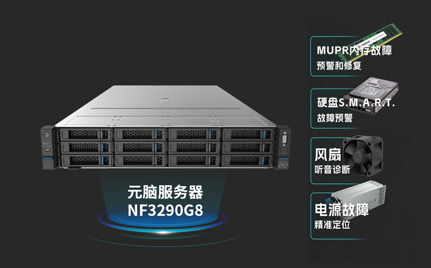 为支持计算性能大幅提升,元脑服务器NF3290G8在散热、管理等方面进行了全面升级,显著降低故障风险。散热方面,该产品在2U空间里建立了高效的散热通道,拥有良好的散热能力,减少寄生电容、电感等不良影响,提升主板电气性能。智能化方面,NF3290G8对内存、硬盘、风扇、电源的故障预警定位和管理进行全方位的智能升级,比如内存故障提前预警、错误实时隔离及故障智能修复,降低内存导致宕机故障率80%。