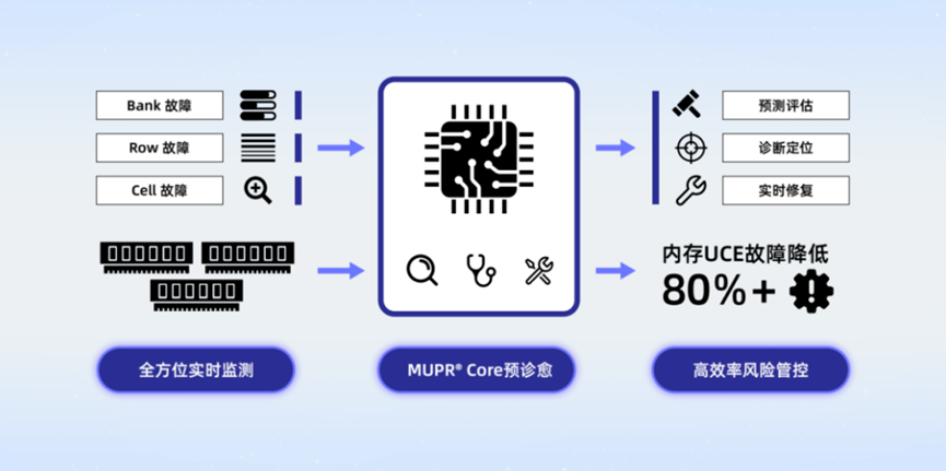 元脑服务器第八代算力平台全新升级的内存故障智能预警修复技术MUPR,从单端预警升级为BIOS、BMC两级防护,通过对上万台服务器故障数据的建模分析和AI模型算法的训练,实现了对内存UCE故障的精准预测和实时修复。