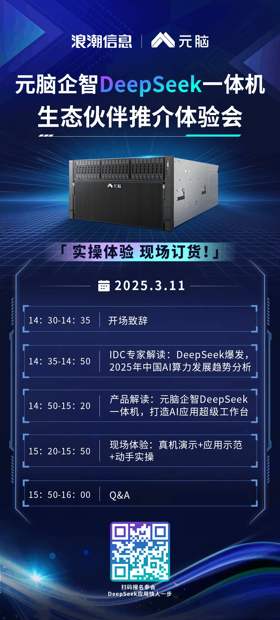 3月11日,浪潮信息将面向全国元脑生态伙伴举办"元脑企智DeepSeek一体机生态伙伴推介体验会"。活动现场,伙伴可深入了解元脑企智DeepSeek一体机的最新功能亮点,上手实操体验深度优化的元脑企智大模型应用开发平台。本次推介会将为参会伙伴提供现场订货服务,助力伙伴DeepSeek行业应用开发快人一步。