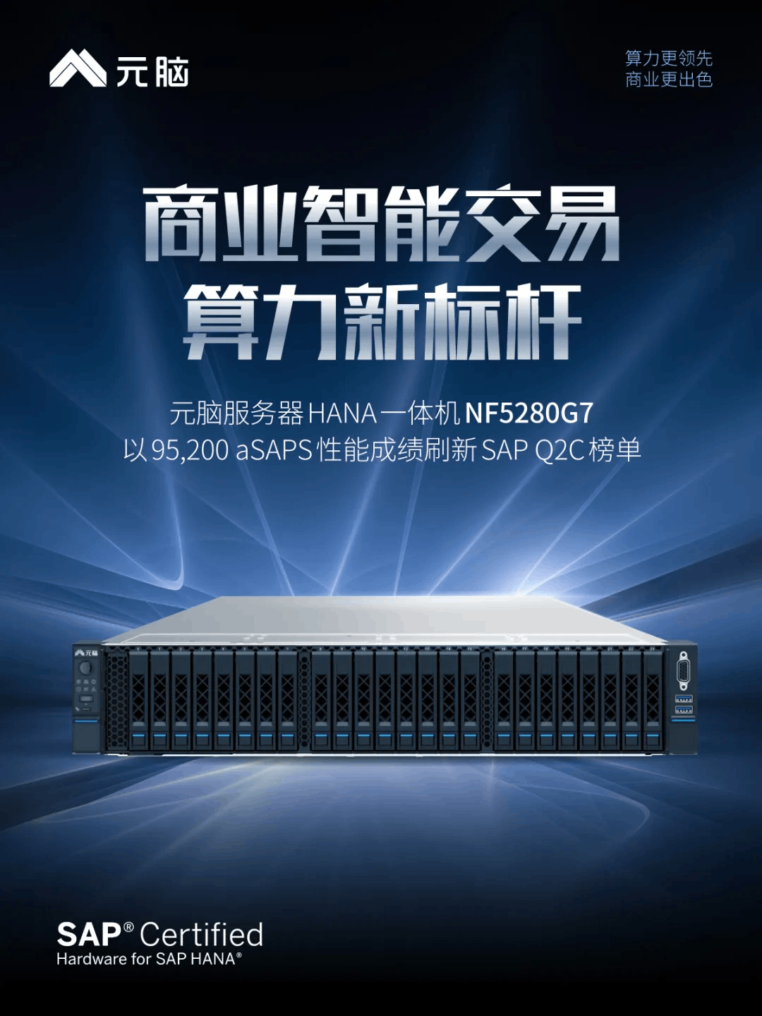 3月5日,全球领先的企业应用软件提供商SAP发布其最新推出的SAP Q2C基准测试结果,元脑服务器HANA一体机NF5280G7在同类平台中创造95,200 aSAPS的最高性能成绩,即在商业交易场景中,每小时能高效处理1,903,922个从企业报价到收款(Quote - to - Cash)全流程订单,并同时执行1904次OLAP(联机分析处理)查询,平均查询响应时间小于0.9秒。