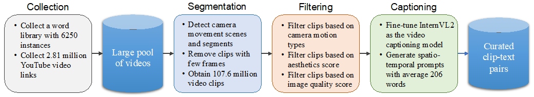 传统数据集(如OpenVid-1M等)主要是静态镜头下的物体运动视频,本身包含的时空一致性内容较少,而DropletVideo-10M首次整合“物体运动+相机运动”的双重动态,全部采用包含复杂相机运动的视频片段,通过独创“收集-分割-筛选-摘要”四阶段构建流程,从长视频中提取时空连贯片段,确保每个样本同时包含主体动作与镜头推拉、平移等运动轨迹,为模型理解真实世界运动规律提供多维数据支撑。