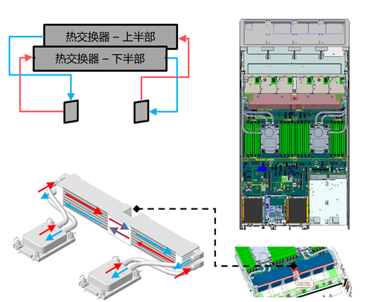 ■ 在服务器节点方面,创新性导入Closed-loop内循环散热器,无需CDU即可在传统风冷机柜内部署液冷设备。相比较传统冷板散热器依赖冷板被动传导热量,Closed-loop内循环散热器通过集成热源、液体/冷媒循环管路、热交换器、回流系统等形成完整的封闭散热回路,采用主动式泵驱循环,冷媒热传导效率显著高于金属被动导热,尤其适用于高功率密度设备。其全封闭设计大幅降低液体泄漏风险,能适应更复杂的工作环境。同时,Closed-loop内循环散热器精巧的体积设计减少对主板区域的占用,模块化架构支持灵活扩展,可通过增加散热器面积、升级泵/介质的流量提升散热能力,灵活适应更高热负载。这一创新设计在保持传统风冷机柜兼容性的同时,实现了散热效率的显著提升。