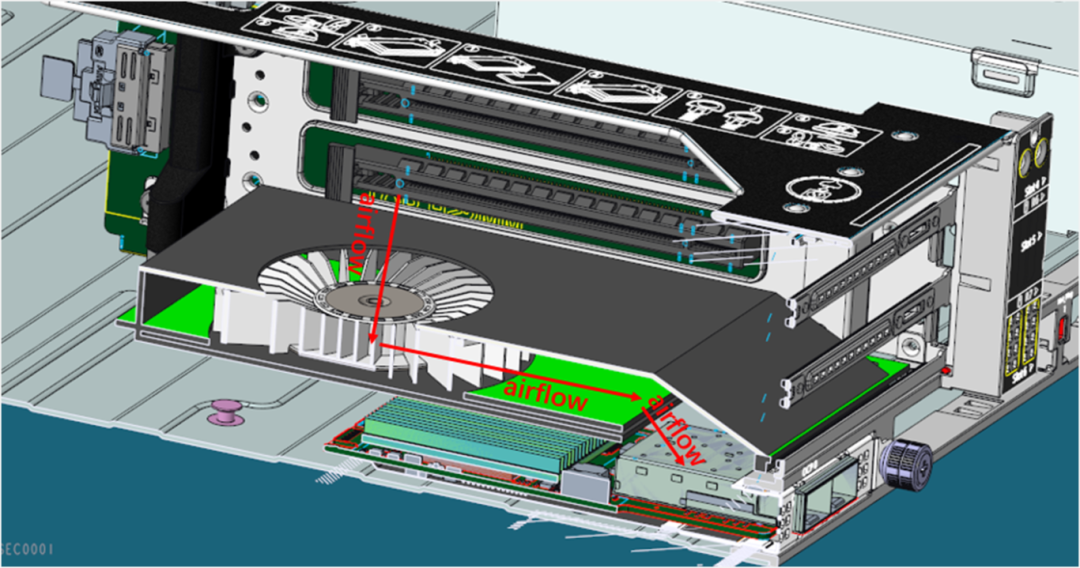 同时,还创新性验证和导入了PCIe标卡风扇部件,配置于OCP上方slot槽位,出风口位置正对OCP光模块,有效解决OCP光模块等热敏部件的关键散热问题,通过不断改良风扇充磁方式、改进扇叶曲面设计,经过上百次形状修正和实际验证,最终选定高效能涡流风扇,大幅节省整机系统风扇功耗。
