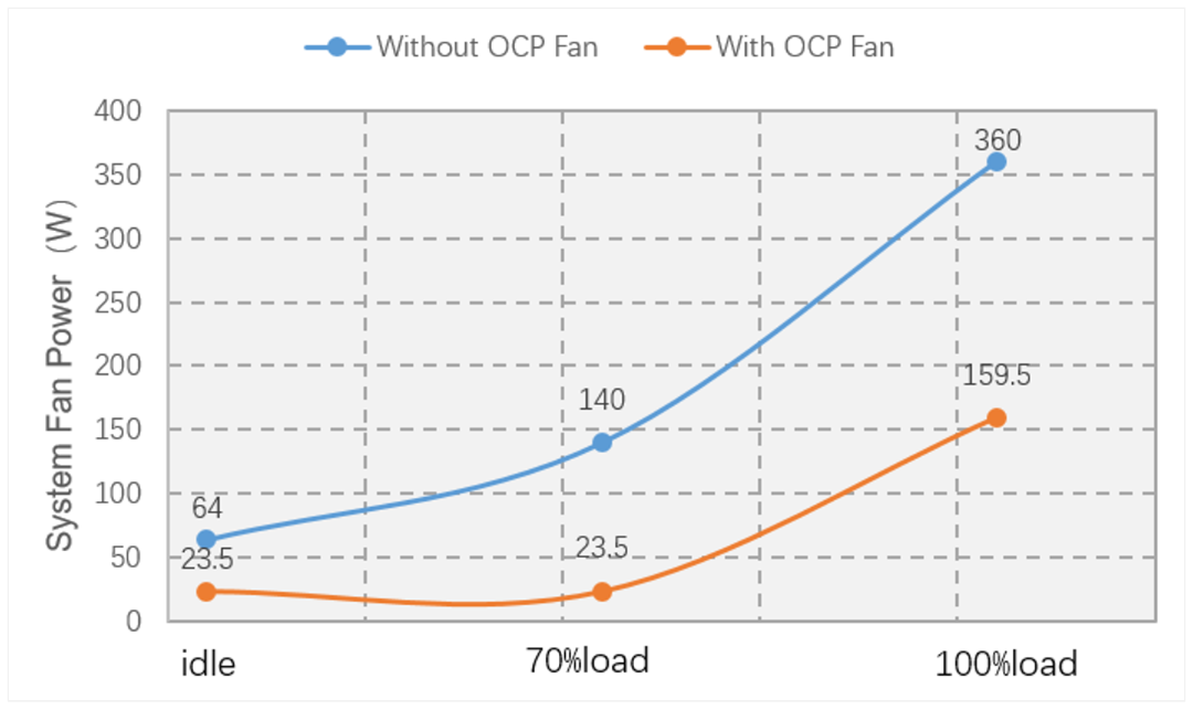 如下图所示,比对200G OCP网卡的散热情况,整机系统在idle、70%load和100%load分别节能40.5W、116.5W、200.5W,最多可降低85%系统风扇功耗。