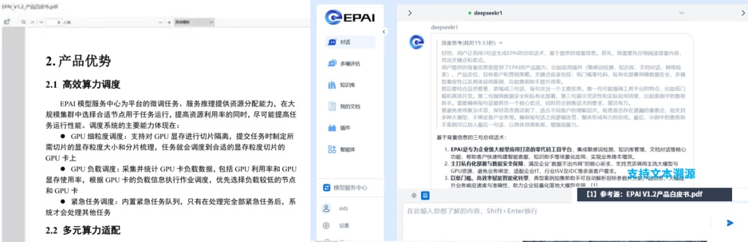 元脑企智DeepSeek一体机在元脑R1推理服务器上搭载EPAI企业大模型开发平台,针对用户最头疼的一体机知识库“三低”难题(知识利用率低、检索精度低、回答有效性低)进行突破,通过自研文档解析模型、"检索-匹配-定位"三级架构、上下文智能扩展等技术创新,实现数据解析、检索增强到可靠输出全流程升级,让用户真正体验到开箱易用、好用,无需复杂操作即可轻松打通业务数据,打造专业的智能助手。