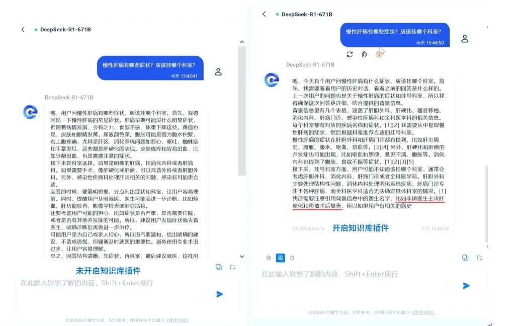 基于上述技术创新,元脑企智DeepSeek一体机为用户搭建知识库应用提供了有力支撑,实践中将用户问题回答准确率提升至95%以上。以医疗行业为例,针对“慢性肝病有何症状以及应当挂什么科室”的用户提问,在构建并接入医院专属知识库前,大模型只能给出相对宽泛的疾病症状介绍和就诊建议;而挂载知识库后,大模型可综合医疗专业知识、医生人员安排等私域数据信息,实现对慢性肝病症状、原因及一般应对措施的全面分析,并且根据本院医生擅长疾病及出诊排期,给出明确的挂号科室、医生及时间建议,实现从简单的通用问答向智能的专业助手转型。