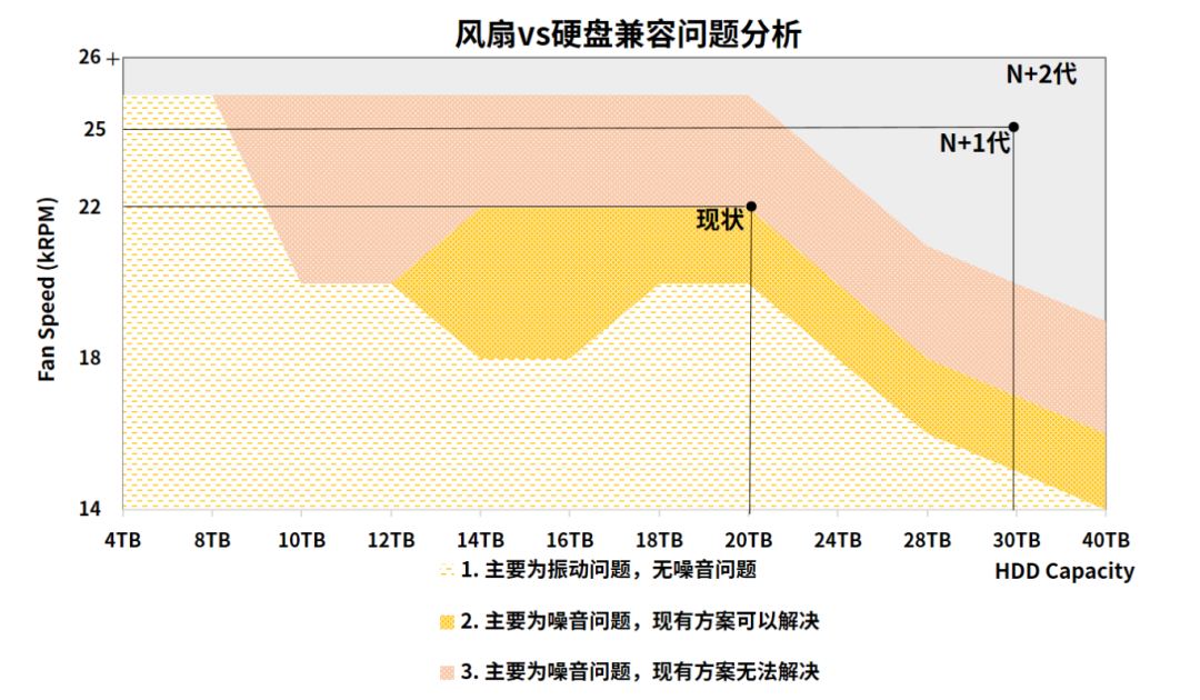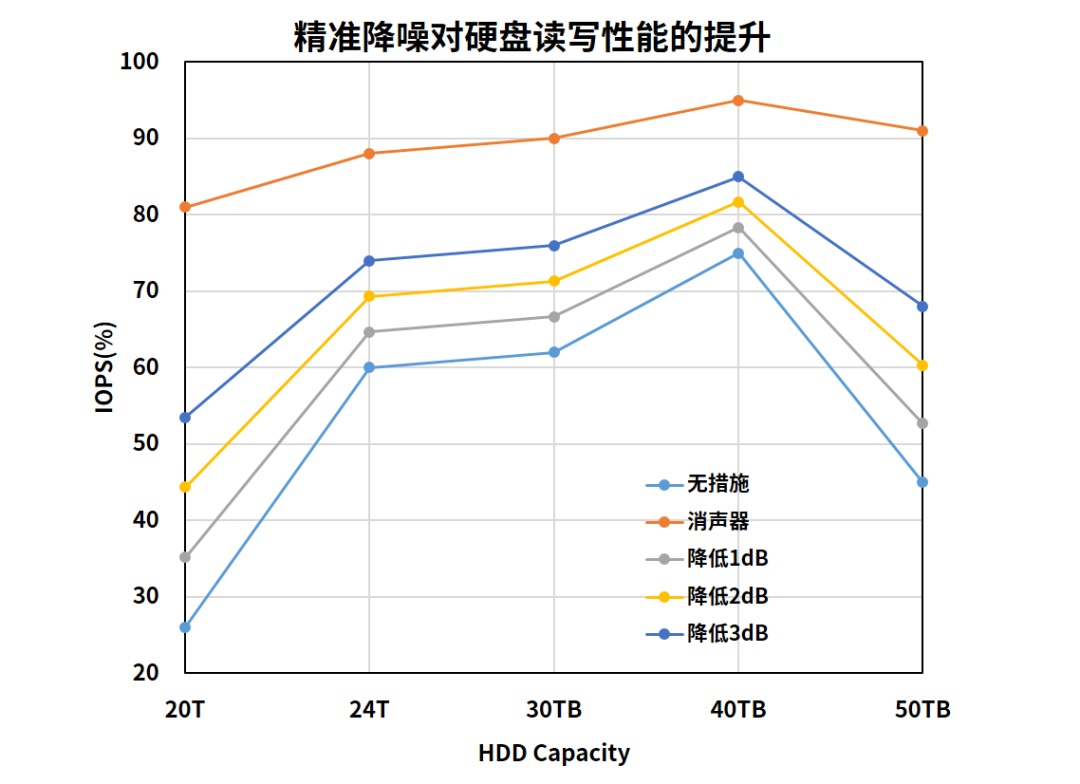 但目前服务器现有的声学降噪方案,包括风扇气动优化、装波导网或者吸音棉等,对机箱内部减振效果较好,降噪效果有限,无法解决高频噪声对20TB以上大容量硬盘读写性能的影响。为了保证系统稳定性,一般的存储服务器只能被迫降频限速,风扇转速限制在1.5万转/分钟以下,导致计算性能大幅牺牲,损失达40%,严重制约计算性能的提升。