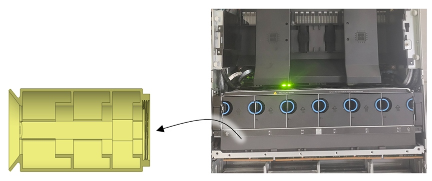 同时,NVH精准降噪方案中的亥姆霍兹谐振腔体结构采用标准化的外部接口和模块化的设计,能够兼容不同的风冷服务器内部结构。模块化的腔体结构基于服务器目标降噪频率和幅值设计,搭配不同风扇或者硬盘时仅需要将其对应的频率的标准化腔体装配入安装结构,即可实现高效的消声降噪。例如针对高密度服务器进行多连胞消声器的融合设计,充分利用现有空间实现降噪方案的配置兼容。