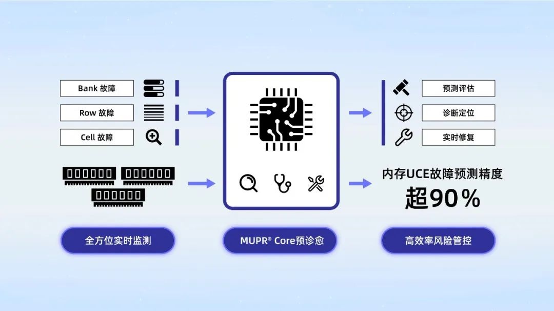 基于对服务器产业客户痛点的理解,依托强大的技术研发实力,浪潮信息在MUPR® 2.0基础上升级系统架构、优化故障检测及告警机制,推出MUPR® 3.0,降低内存修复时CPU负载,保障核心业务无感知稳定运行,以颗粒级故障预测精度将不可纠正UCE故障预测准确率提升至90%以上,系统宕机率大幅下降,整体运维效率显著提升。