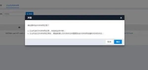 用户通过可视化操作界面向计算API发送云主机内存快照恢复请求,云主机所在节点的计算服务会对该请求消息进行处理,为了保证云主机内存和磁盘数据的一致性,首先需要恢复云硬盘快照数据,待云硬盘快照恢复成功之后,进而继续恢复内存快照数据,待内存快照恢复完成,云主机会以内存快照时刻的状态继续运行。下图所示是浪潮信息产品云主机内存快照还原操作设计控制台。
