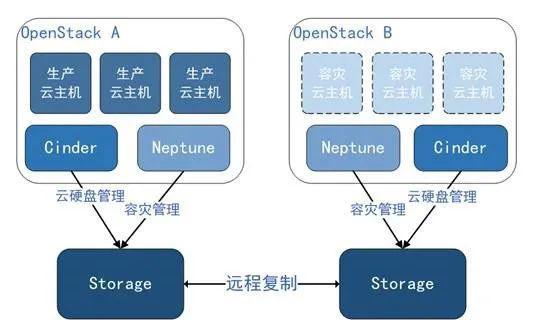 容灾资源的创建、删除和切换等管理功能依赖于浪潮信息 OS自研容灾管理组件Neptune,Neptune分别部署在主备两个容灾中心,对接各自中心的存储设备进行容灾管理。浪潮信息OS在为生产云主机增加容灾保护时,首先会根据生产云主机的规格在容灾中心通过Cinder创建相同规格的云硬盘,然后通过Neptune组件,在存储上创建两个云硬盘的远程复制关系,接着在容灾中心根据这个云硬盘创建出容灾云主机。至此生产云主机已经具备容灾能力,开启保护后,生产云主机的数据就会实时同步至容灾中心对应的容灾云主机中。