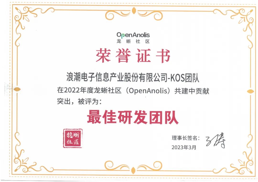 在日前举行的龙蜥社区(OpenAnolis)第三届理事大会暨2022年度优秀贡献者颁奖典礼上,浪潮信息KOS团队获得“2022年度龙蜥社区最佳研发团队奖”。