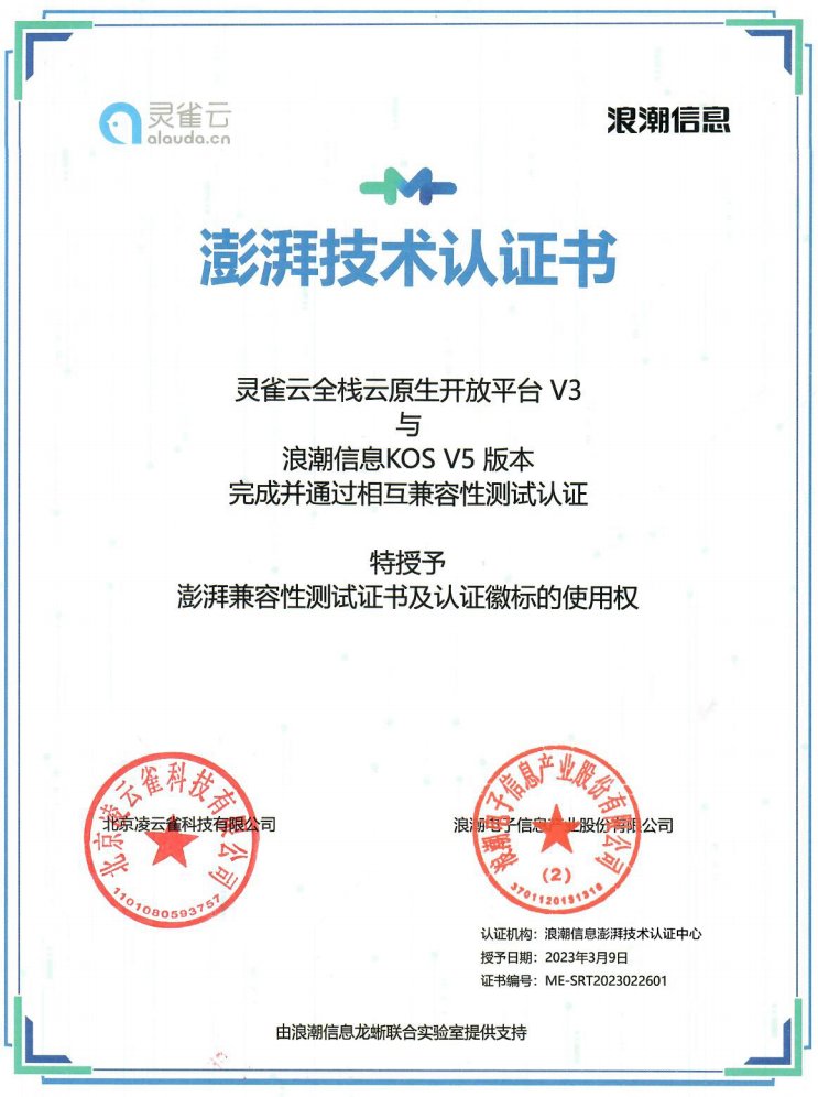日前,灵雀云全栈云原生开放平台ACP V3与浪潮信息KOS V5完成澎湃技术认证,测试结果显示,灵雀云ACP V3与浪潮信息KOS V5完全兼容,满足功能需求,系统运行可靠稳定,性能表现优异。
