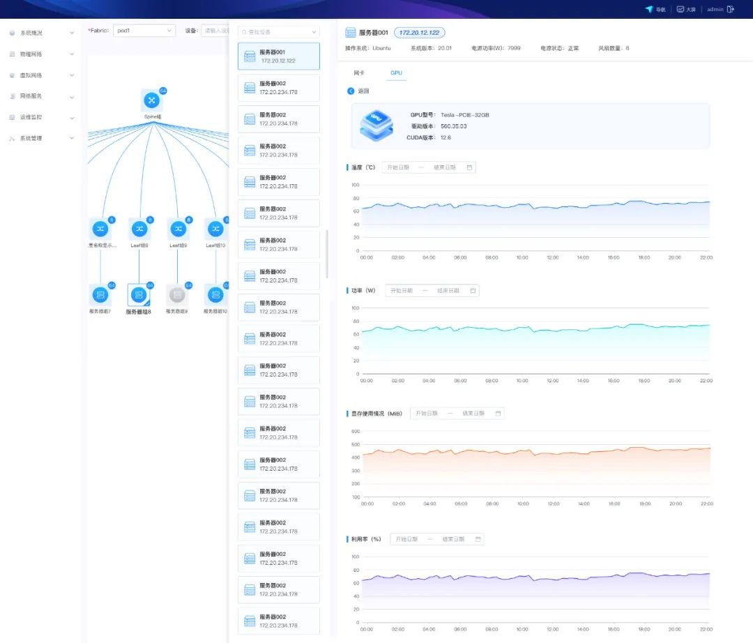 端到端统一管理:支持南北向标准协议,支持第三方工具与自定义应用开发,支持交换机、服务器、网卡、GPU的统一纳管,实现主机侧、网络侧的统一管理。