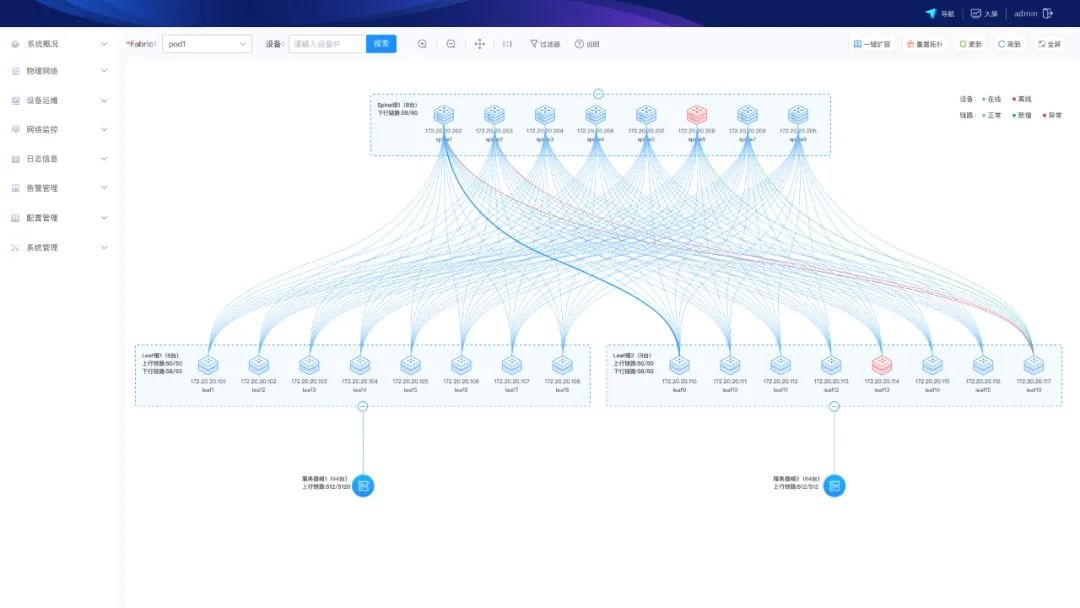 动态网络拓扑自动生成:实时反映智算中心网络健康状态、性能情况与连接关系。