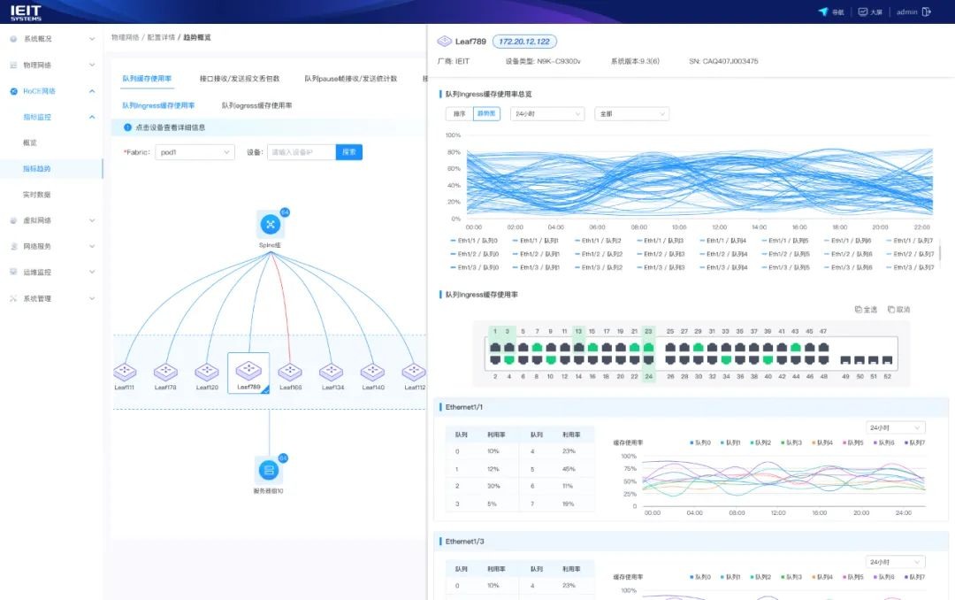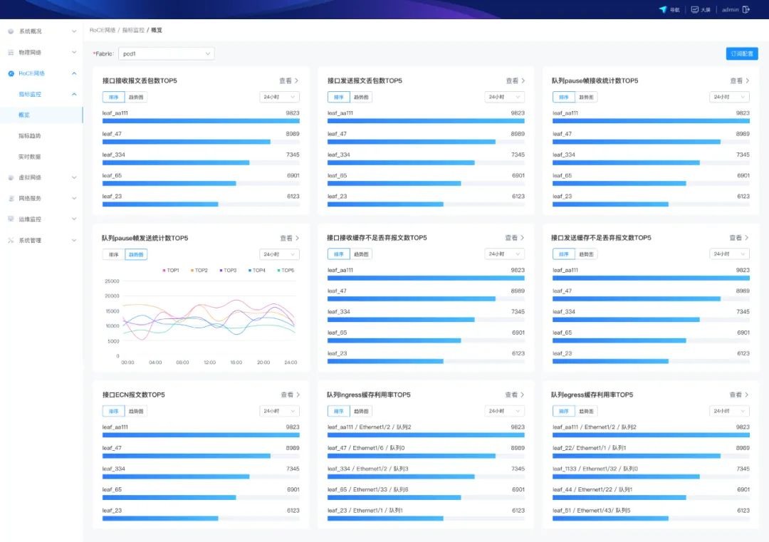 自定义可视化仪表盘:用户可多维度自定义网络监控仪表盘,实现对RoCE流量、带宽负载、延迟、丢包、拥塞等AI训练和推理过程中的核心关键指标进行个性化监控管理。