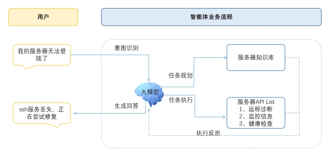 智能体架构彻底颠覆了被动响应模式。它以大模型为决策中枢,整合实时数据接口、自动化工具链与多步推理能力。在运维场景中,智能体的处理逻辑为: