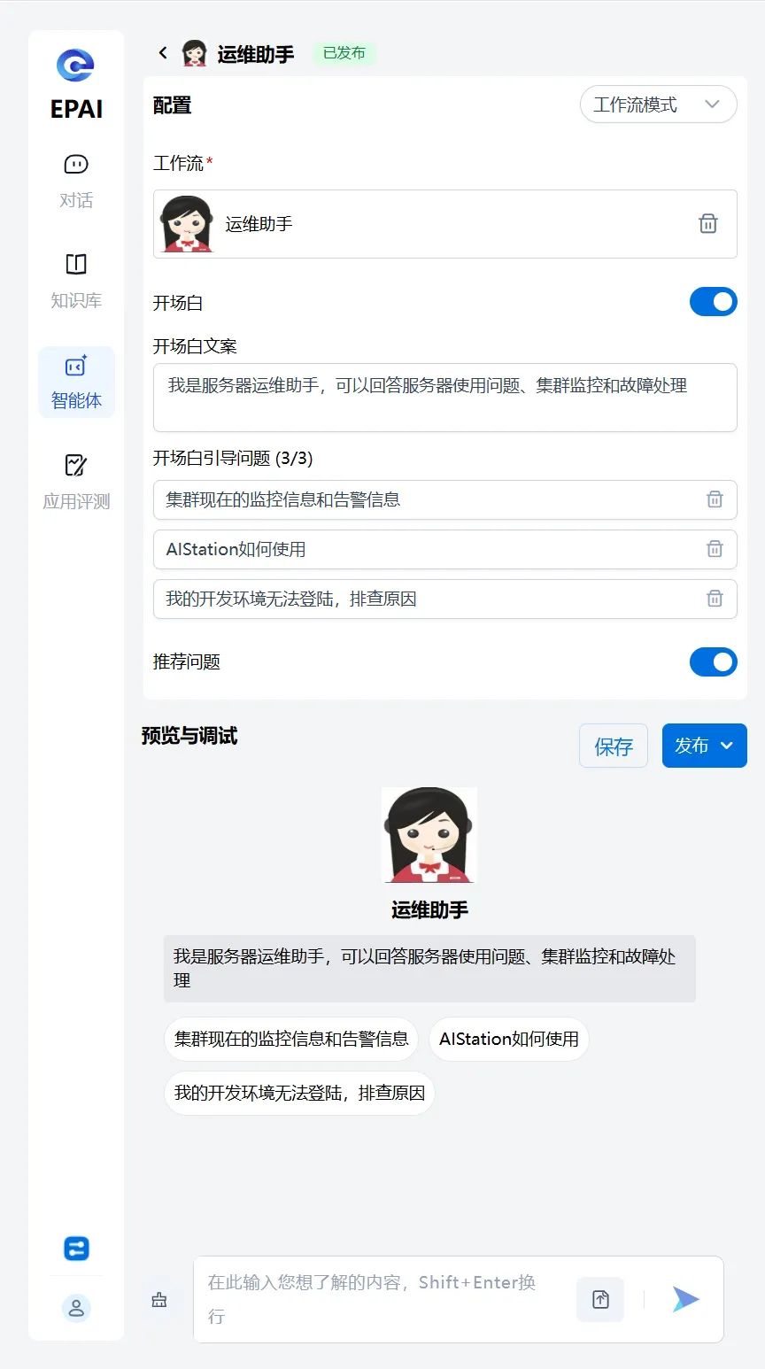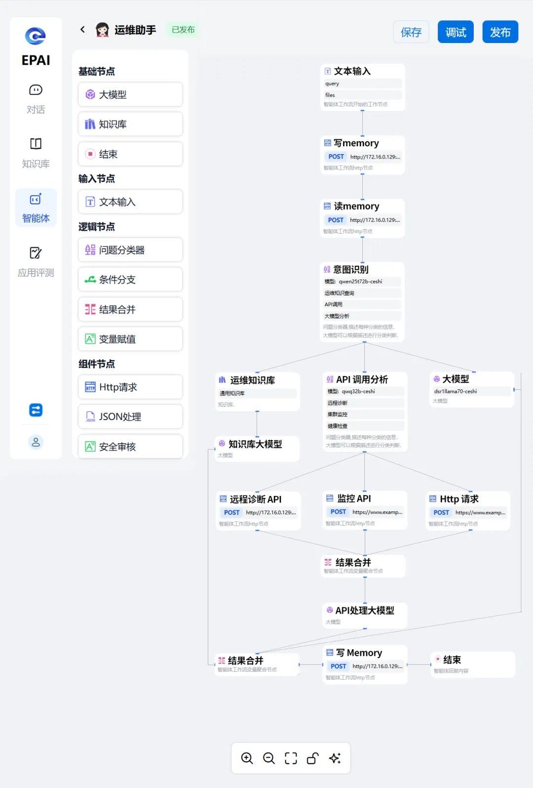 在元脑企智EPAI智能体页面只需通过拖拽式工作流编排,即可定义智能体的决策逻辑和执行路径。以运维助手为例,用户输入问题后,先读取并写入历史记录,然后通过“问题分类器”对问题的意图进行分析。根据问题分类,分为三个业务分支。第一个分支查找问题解决方案,通过大模型+知识库输出。第二个分支对问题定位分析,通过调用API进行集群监控、健康检查和远程诊断等。第三个分支处理一般性问题,引导用户问题。三个分支的问题都会保存到历史记录并输出最终结果。