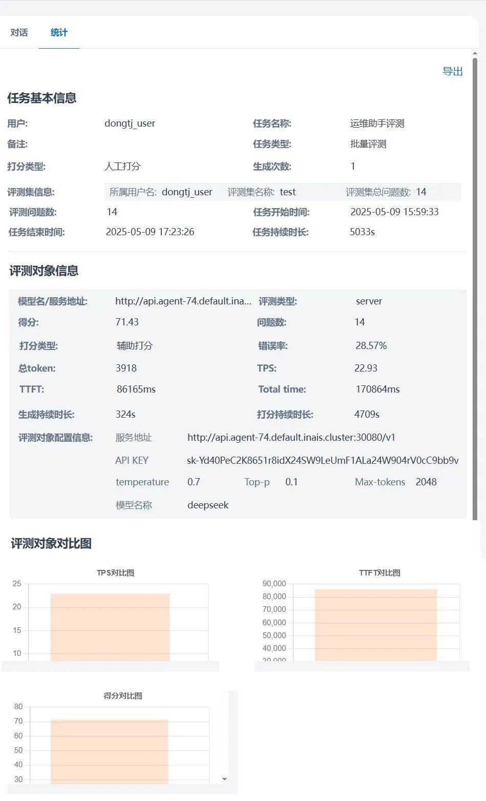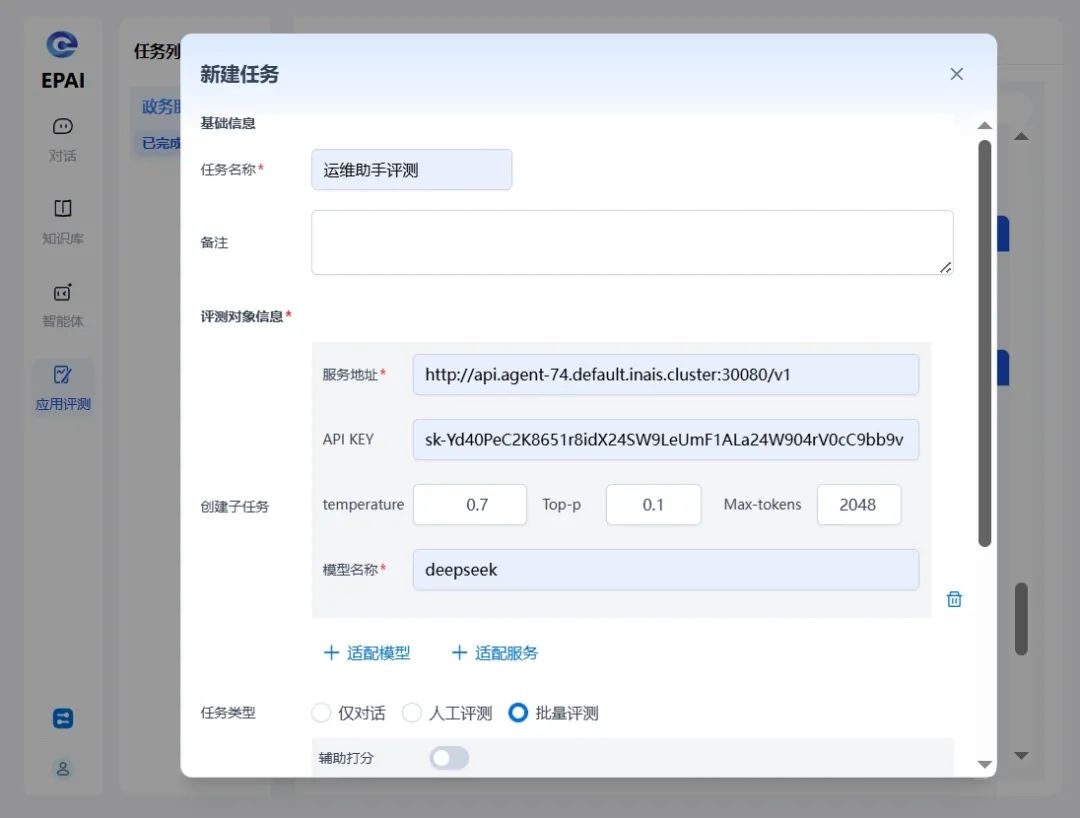 智能体配置完成后,企业可以在元脑企智EPAI的“应用评测”界面进行评估。只需填写服务地址、API-KEY和评测集,就能够自动评测智能体应用的能力。