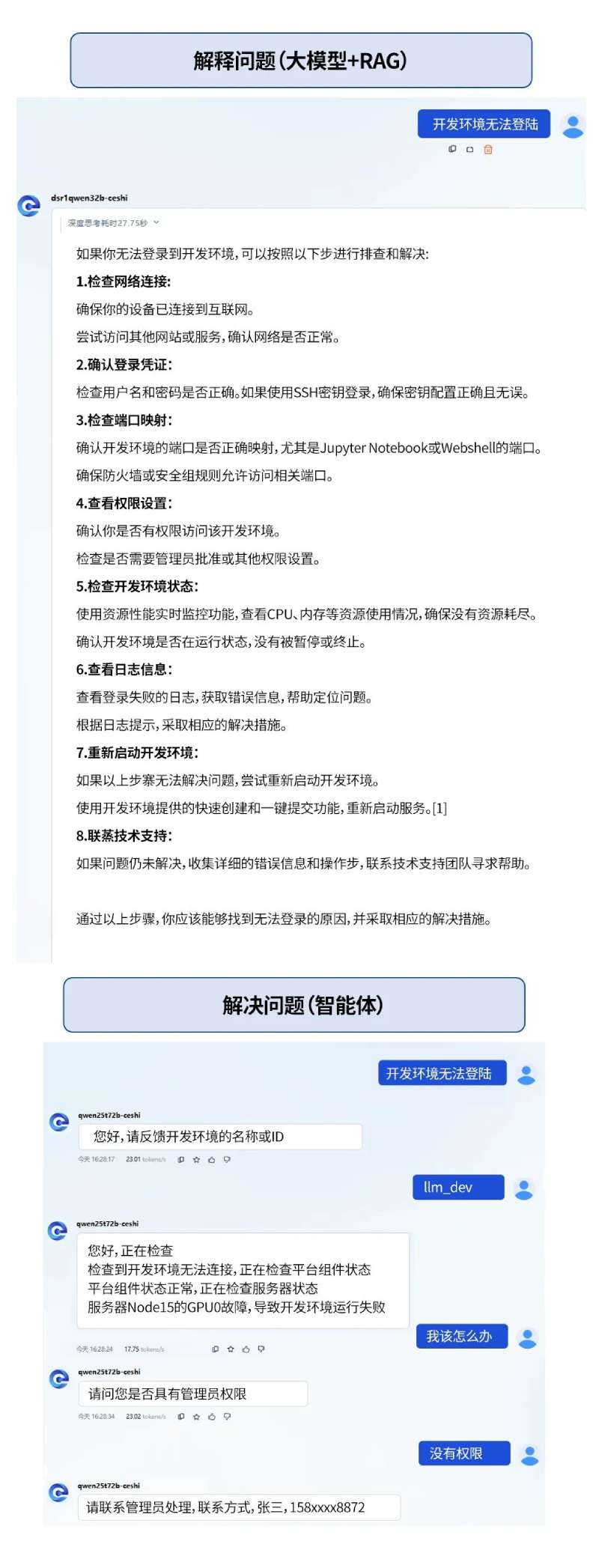 最后,我们对比下前后效果。面对同一个问题,基于RAG的智能运维助手仅能解释问题,需要用户自己解决。而使用智能体后,智能运维助手能够和用户进行交互,从而定位出问题,并根据用户权限给出解决问题的办法。