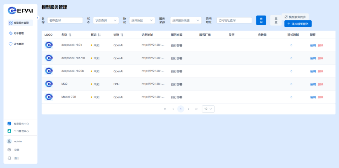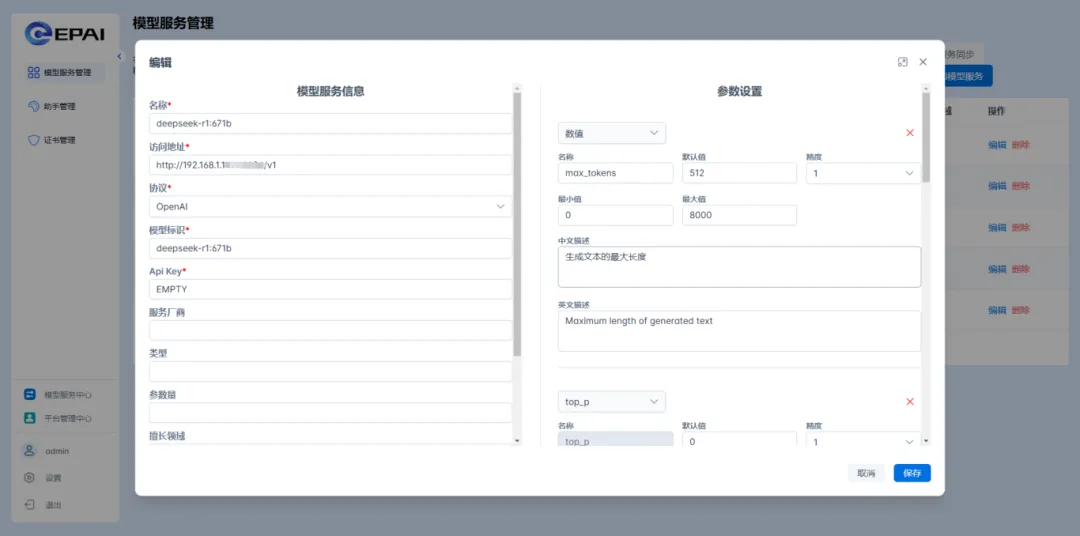 Step 2:登录元脑企智EPAI管理平台,进入模型管理,选择添加模型、填写模型名称、接口地址和API-KEY(如果没有设置填写EMPTY),完成模型接入;