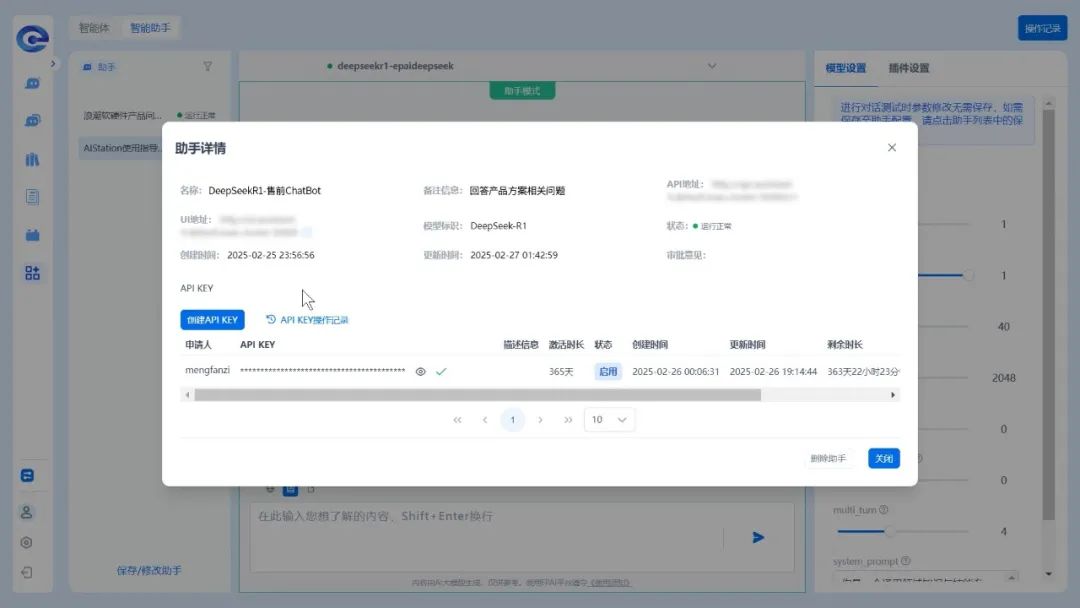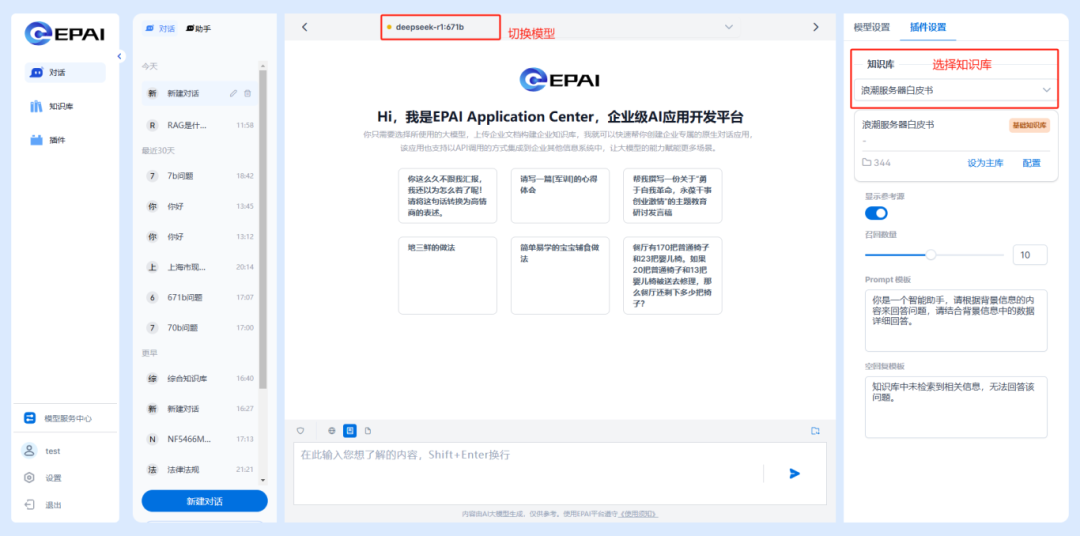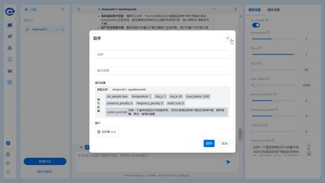 Step 4:登录元脑企智EPAI模型应用平台,选择DeepSeekR1 671B模型,并启用知识库,选择一个或者多个企业知识库,在对话界面可快速测试智能助手功能,确保响应速度与准确性。测试完成后,点击“保存助手”即完成DeepSeekR1 671B基于知识库进行问答的ChatBot助手开发;