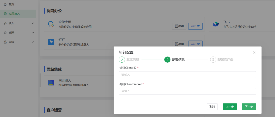 Step 5:在元脑企智EPAI中将该智能助手发布为标准API接口,再根据页面提示填写钉钉应用配置,即可集成至钉钉系统内,实现钉钉群聊的无缝调用。
