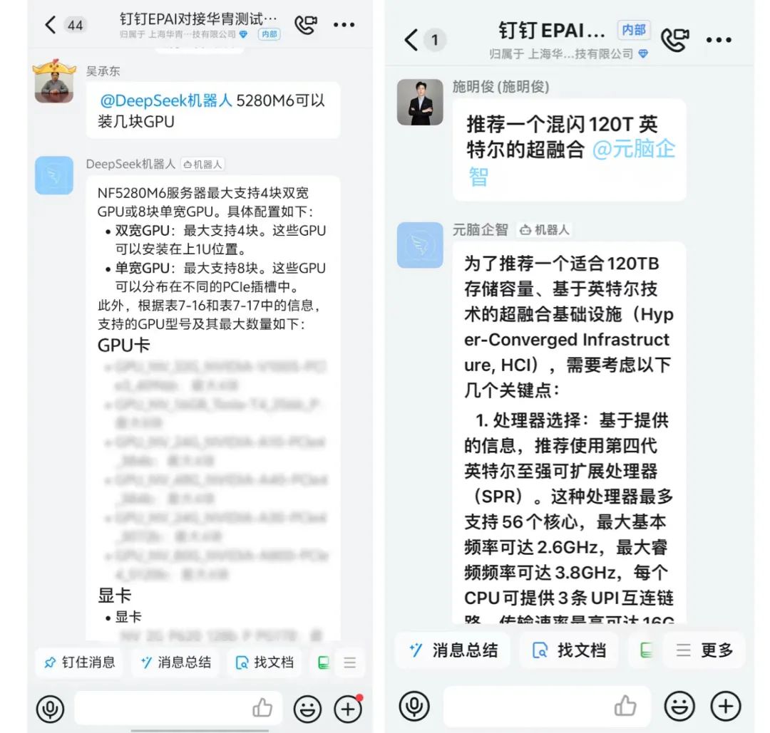 借助元脑企智EPAI的端到端RAG系统解决方案,上海华胄上传了数千份企业技术文档、解决方案库及历史项目数据,依托内置的文档解析模型(EPAI-Parser)与中文文本检索嵌入式模型(Yuan-EB),快速构建了精准、高效的本地私有化知识库。通过EPAI平台,上海华胄调用满血版DeepSeek-R1大模型,进一步开发了智能问答机器人,并将其深度集成至钉钉工作系统。