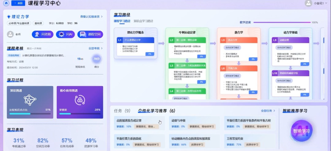 例如,根据学生学习情况、考核情况,生成学习情况报告,对学生进行智能学习路径推荐。智能路径推荐包括针对教师教学计划的路径推荐、学生兴趣学习路径推荐、针对学生能力弱项的路径推荐,甚至就业倾向对应学习路径推荐等等,满足学生个性化学习的需求。学生的学习情况、考核情况等数据,也会推送给教师,成为智能教学的数据基础。