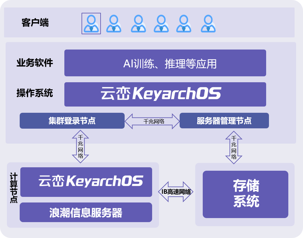 采用全套浪潮信息服务器+云峦KeyarchOS操作系统,实现预装交付和同品牌统一运维,软硬协同,充分释放硬件性能,支撑推理、训练等AI应用大规模上线。