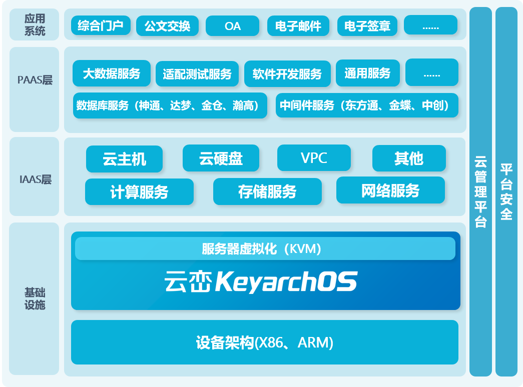 采用浪潮信息KeyarchOS作为云平台底层OS,兼容现有基础设施,向上接入云平台,支撑业务应用,管理各类资源。