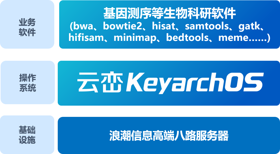 客户采用浪潮信息高端八路服务器,搭载英特尔第四代至强可扩展处理器;云峦KeyarchOS对硬件完美兼容,充分释放性能,同时向上支撑生物科研软件,支撑客户工作高效开展。
