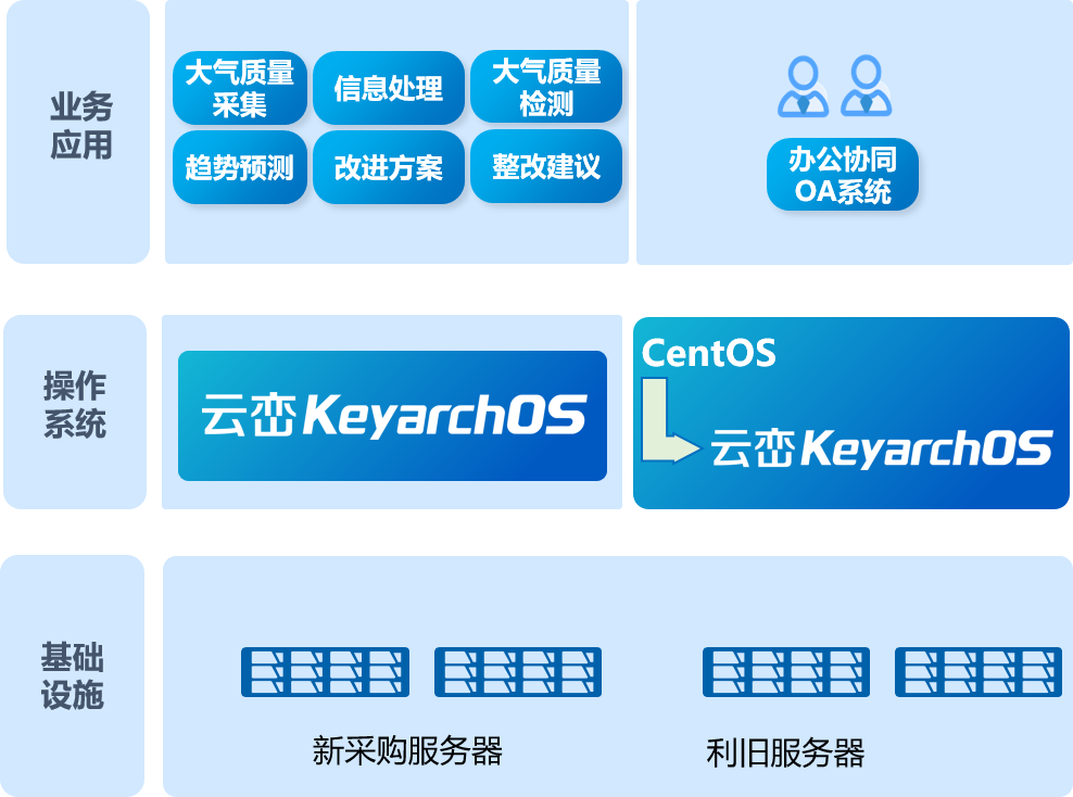 新采购服务器预装KeyarchOS,运行自研软件。利旧服务器从原有CentOS迁移到KeyarchOS,用来运行OA等办公软件。