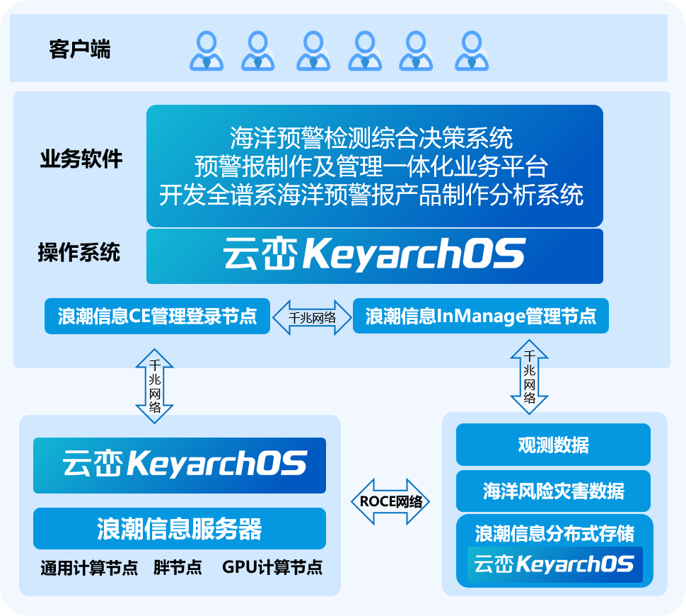 采用全套浪潮信息的高性能的软硬件基础设施,包括高性能计算节点、计算胖节点、高容量并行存储节点以及高速网络设备,并以云峦KeyarchOS为底层操作系统,共同构建海洋高性能数值预报集群系统,确保数据的快速采集、全面整合与长期保存,为科学研究与业务决策提供数据支撑。