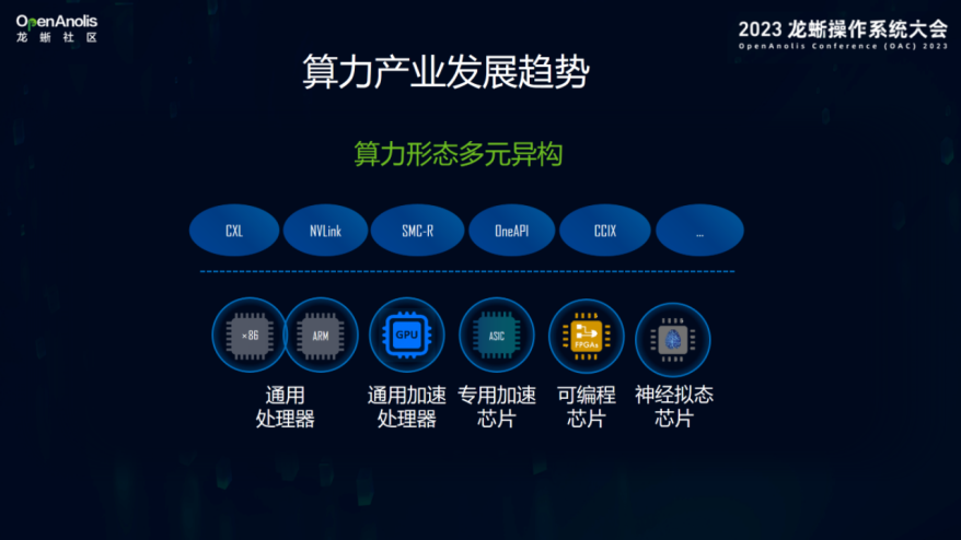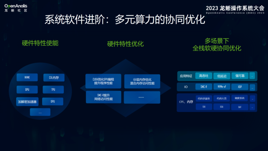 系统软件进阶首要目标就是实现多元算力的协同优化。当前,众多采用不同架构的计算芯片、存储芯片,以及由此衍生出的复杂网络、互联协议等等,需要硬件特性使能,并予以持续的硬件特性优化,同时也要对配套的系统软件、平台软件展开优化,特别是对操作系统的优化,才能最终实现在多场景下的全栈软硬协同,为算力释放提供更好的支持。