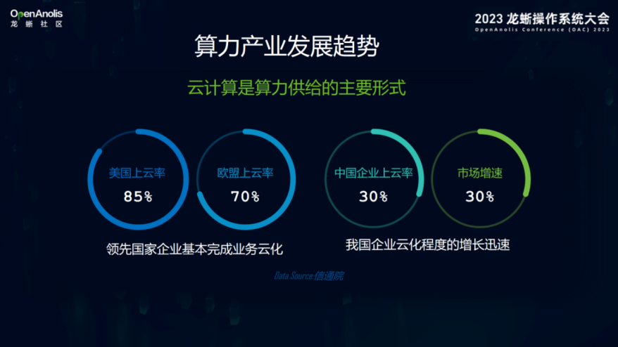 其次,是算力供给服务化。随着生成式人工智能的发展,基础大模型对算力的需求暴涨,依靠云架构来完成算力供给成为大的趋势。目前,全球绝大部分的算力都是通过云来提供。从整体来看,中国虽然发展很快,但是上云的比例仍然很低,30%的上云率远低于美国的85%和欧洲的70%,也就是说中国的云计算成长空间很大,但要走的路也很长。