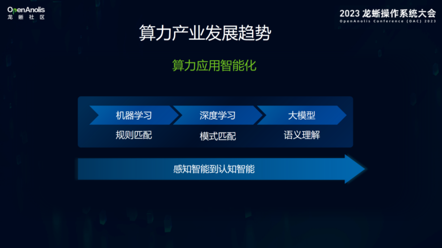 最后,是算力应用智能化。人工智能从机器学习到深度学习,现在进入大模型的时代。之前,模式匹配的图像识别已经广泛应用起来了,而随着最近两年生成式人工智能的发展,以ChatGPT为代表的现象级应用的出现,基于语义理解的大模型以及多模态大模型也逐步渗透到应用中。从感知智能到认知智能,算力应用走向智能化,因此对人工智能的支持也成为算力产业发展非常核心的方向之一。