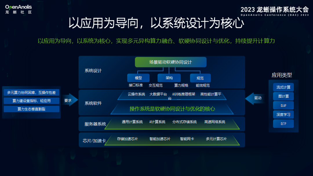 在算力产业的新发展格局下,要以用户思维,真正关注“算力如何为应用提供最好的支撑”。算力的释放从来不是单点式的,芯片性能的提升是一个重要因素,但不是唯一的,配套的系统软件同样是关键要素。因此,应该从系统全局考虑,坚持以应用为导向,以系统设计为核心,实现多元异构算力融合、软硬协同设计与优化,持续提升计算力。这个转变的一个关键点,就是要实现系统软件的进阶。