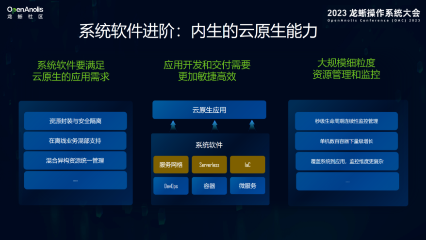 第二,未来的应用基本上大部分都是云原生的,系统软件的进阶要面向云原生应用场景支撑优化。在云里,尤其是从虚拟化到容器的全面转换过程里,需要对资源更好的进行安全封装隔离,对在离线业务进行混合部署,对异构资源统一管理,这些是对系统软件最基本的要求。同时,云原生场景下的应用开发,如Serverless、Service Mesh等,与传统应用开发有很大的区别,其开发环境的构建也需要操作系统、基础软件的底层支持。此外,在云原生环境下,对资源的监控、调度、管理,会比原来物理机管理、虚拟机管理更加复杂,量级从千级万级,可能增长到千万级、亿级,对上亿个容器,上亿个各式服务进行管理,这需要系统软件提供大规模的、更细粒度的管理能力。