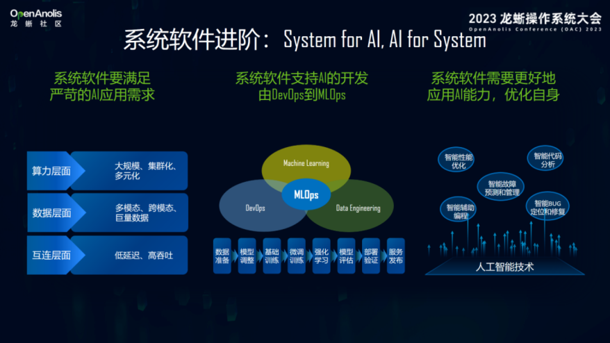 第三,系统软件要与人工智能深度双向融合。现在人工智能发展非常快,大模型的出现,需要系统软件的技术演进,去满足对大算力环境的支持,对数据多模态、跨模态巨量数据的管理,以及对各种新型融合网络的架构支持。同样,人工智能开发也不同于传统开发,以前讲DevOps从开发到运维,而人工智能大模型的开发涉及到数据准备、模型调整、基础训练、微调训练、强化学习、模型评估、部署验证、服务发布等复杂的流程,DevOps在向MLOps转化,需要系统软件给予支撑。